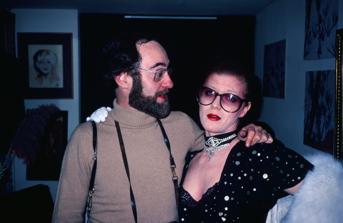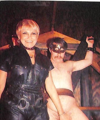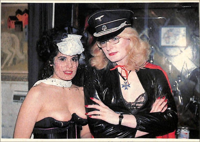 It was an unforgettable evening: Mistress Mir dressed as a rubber nun accompanied by her latex wrapped husband Tony; chef Robert Maxwell in a bowler hat with veil and a maribou feather jacket supervising Cynthia the six-foot-five TV maid; the delicious birthday cheese cake decorated so imaginatively by Annie Sprinkle (all the porn stars fought over the little lipstick tubes she had put on top). Mr. Vera danced a hot samba with Ms. Leonard, and I enjoyed rubbing my ass into the leather clad crotches of editor Rutter and he-man Dino D’Macho.